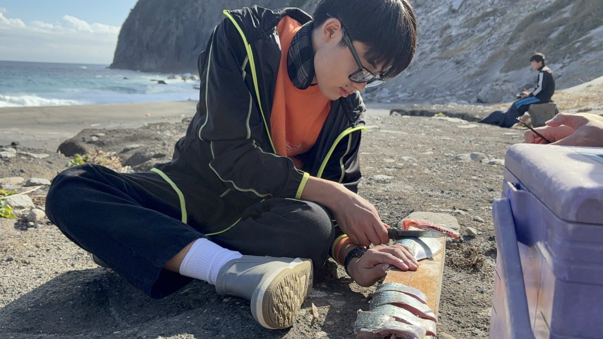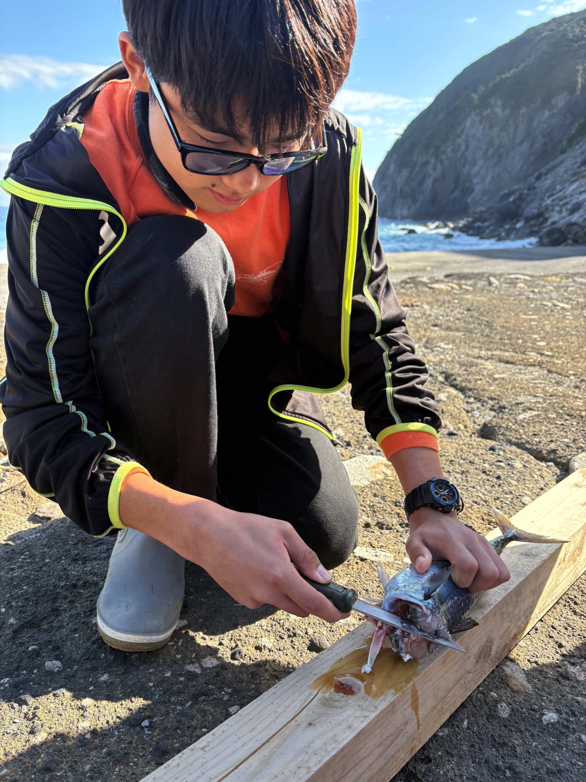 昨日釣ったサバを参加者が自らさばき、塩焼きに。