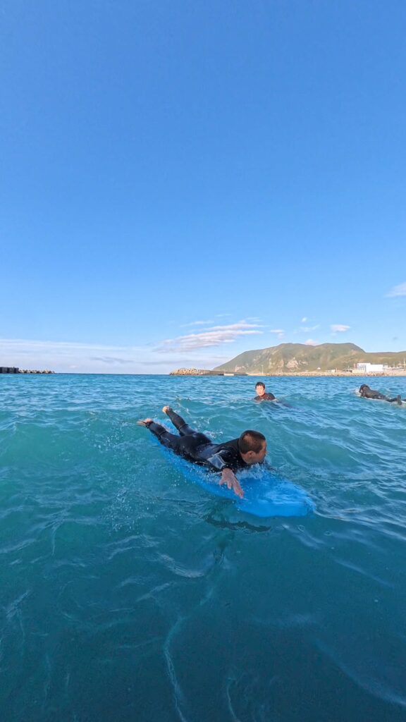 昨日と比べて、子供たちにも少し小慣れた様子が見える。波待ちもできるようになって、さざ波の中、海の上での会話が弾むようになった。